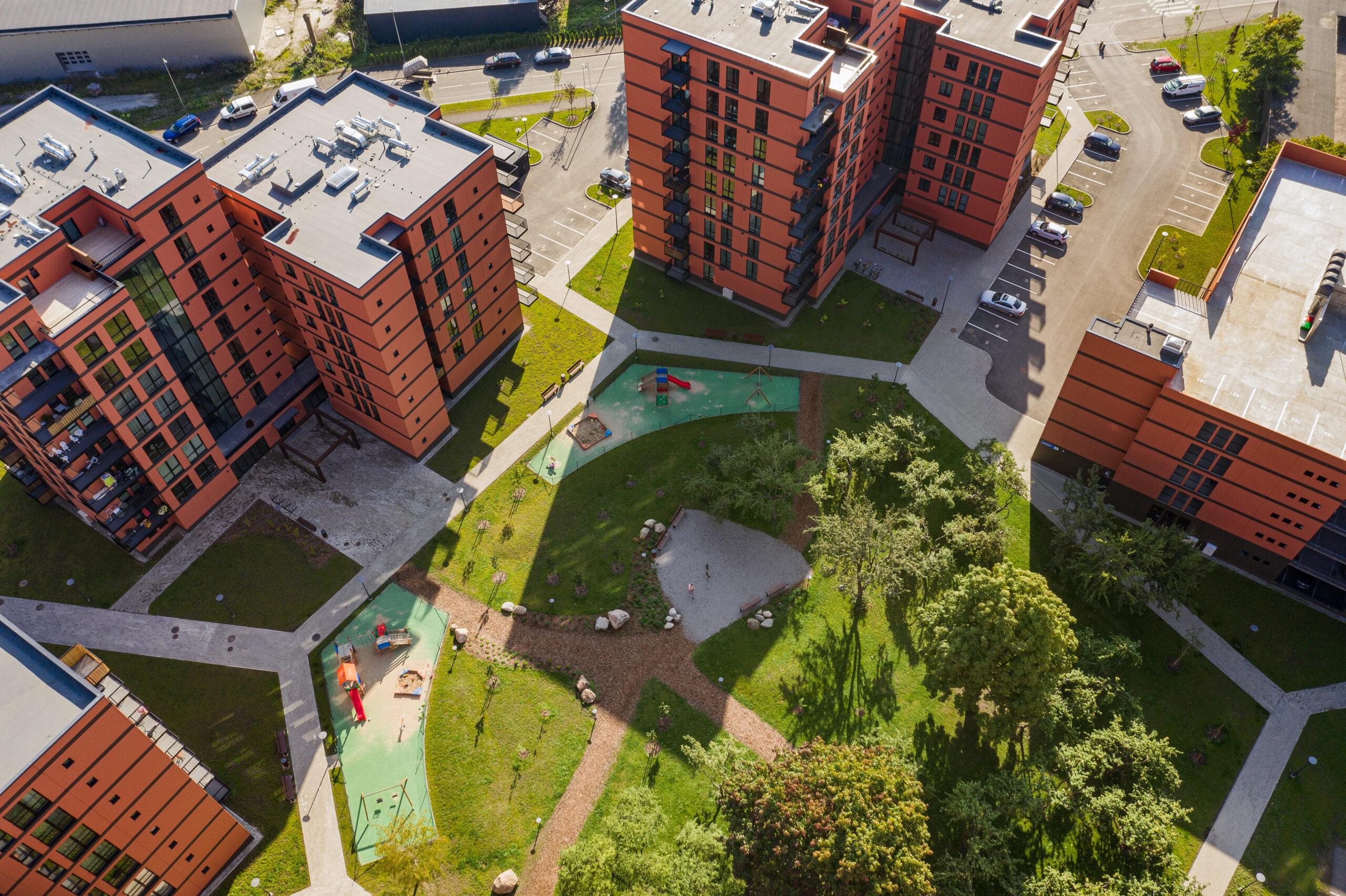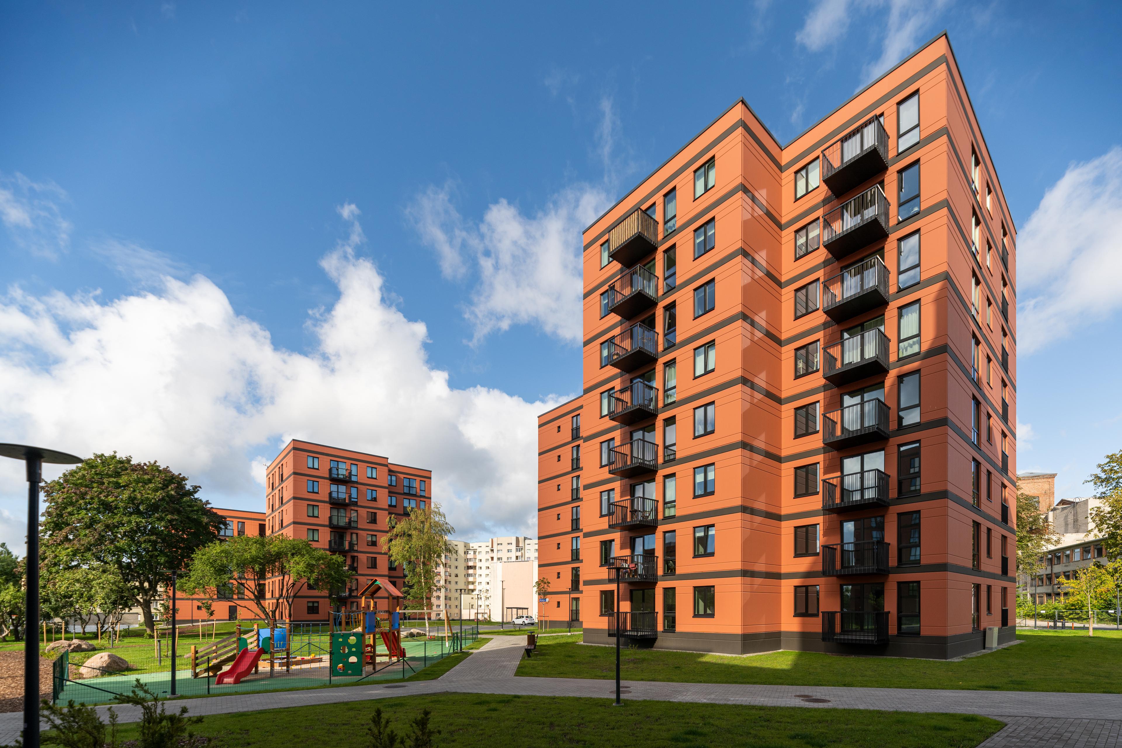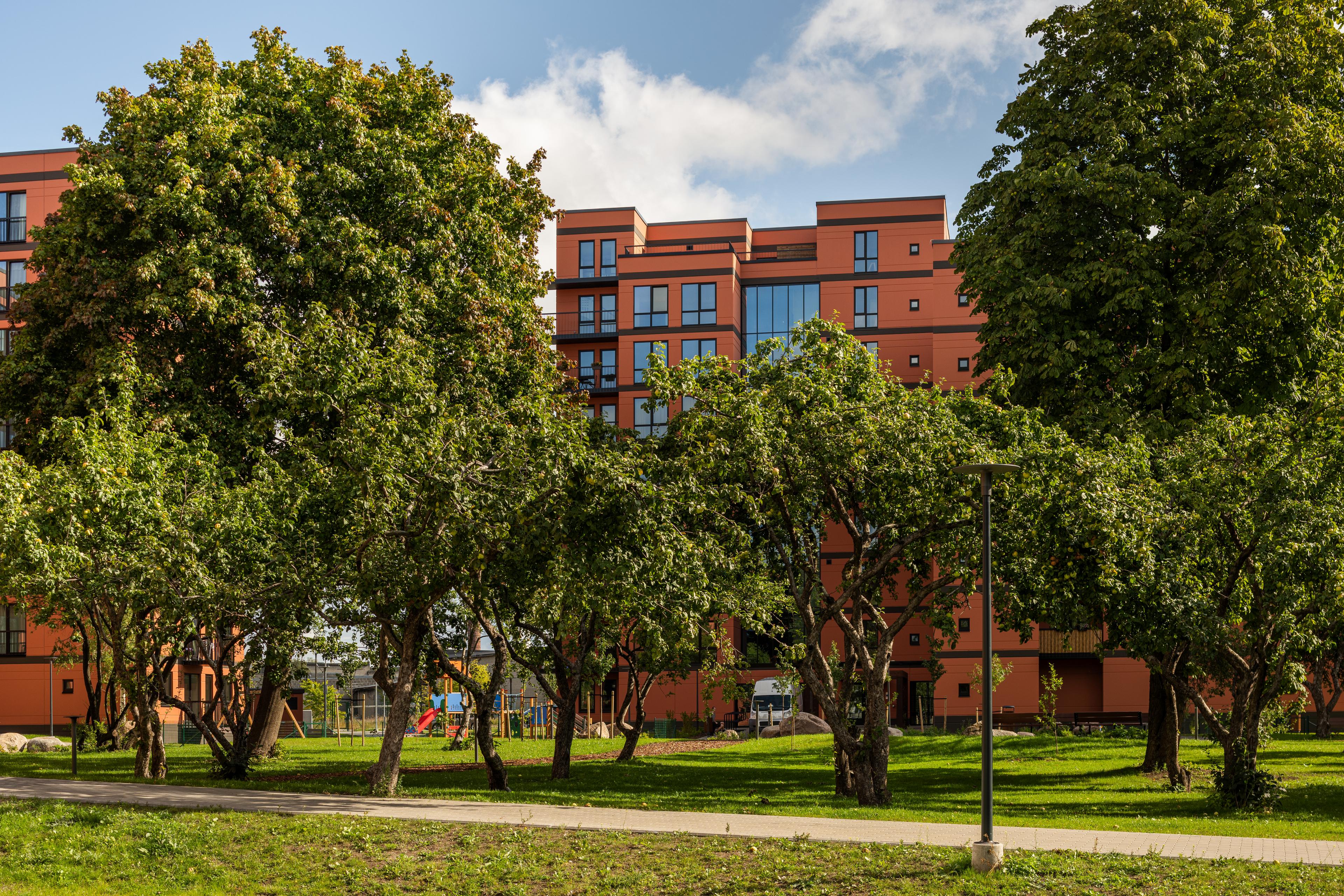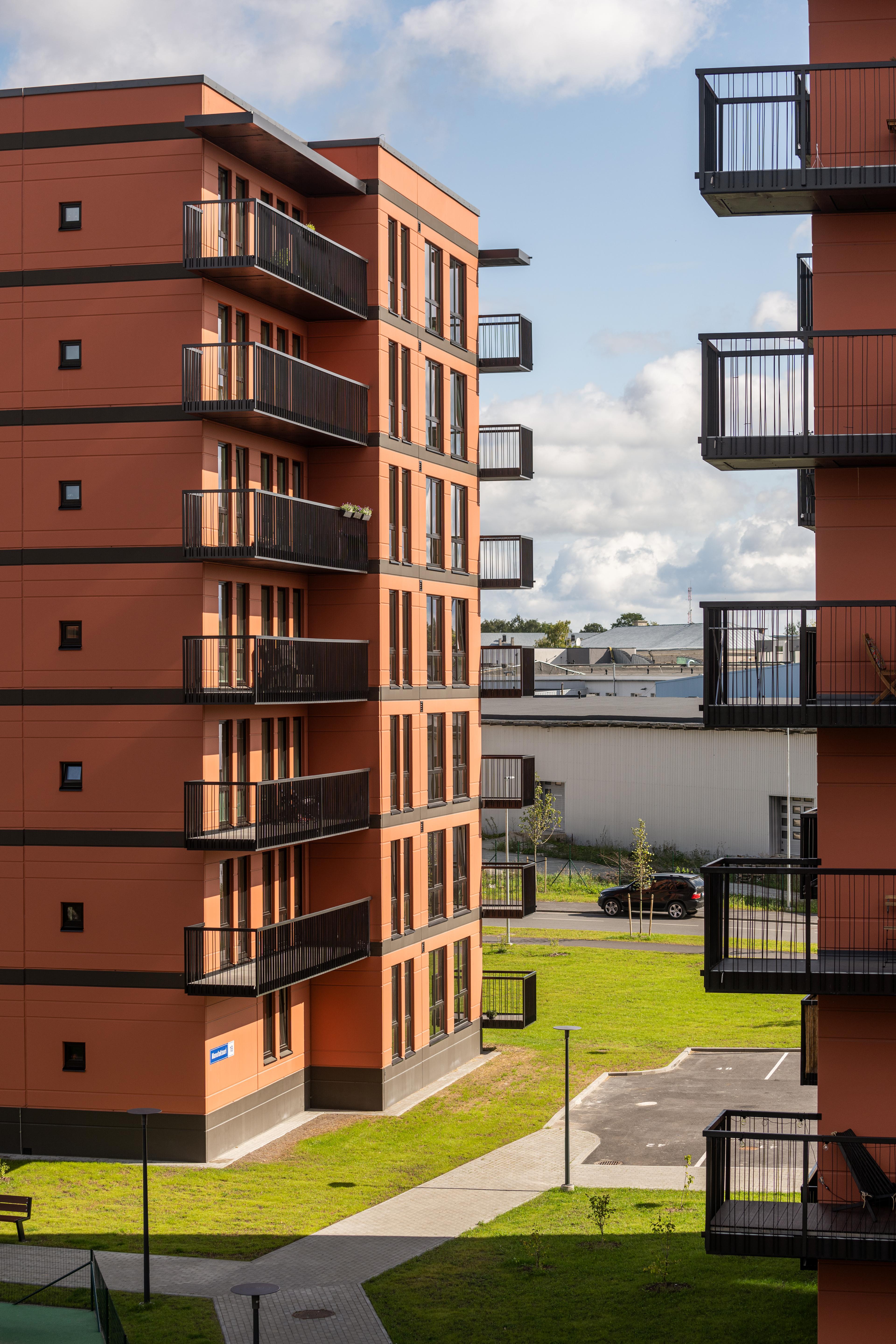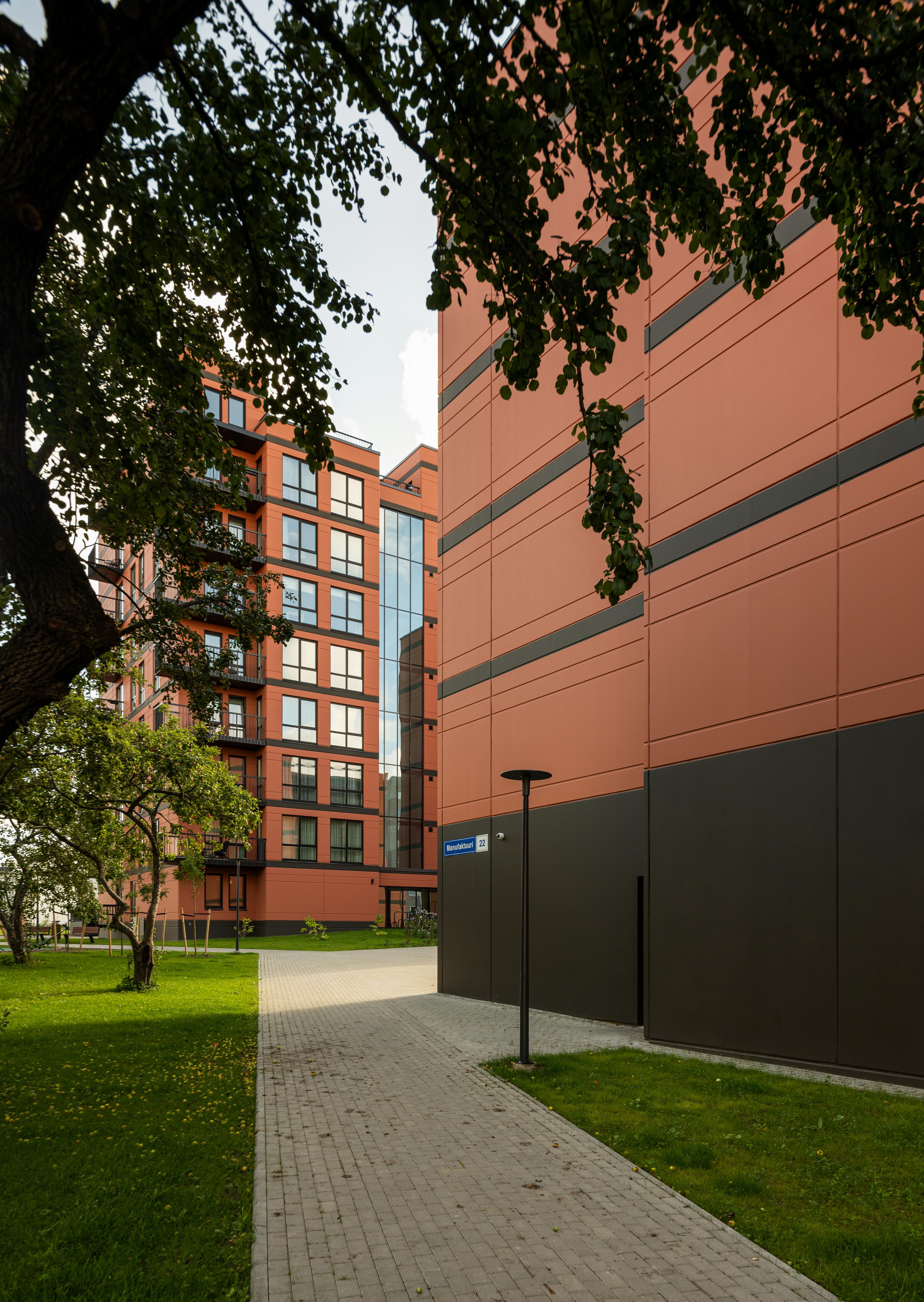 The architectural solution of the buildings is based, on the one hand, on the urban planning considerations set forth by the detailed plan and, on the other, on design choices that honor the site’s history and enhance the sense of place. The latter is reflected in a respectful dialogue with the historic buildings of the former Balti Cotton Mill, whose architectural motifs such as brick facades, vertical volume articulation, window proportions, and rhythmic composition are subtly echoed in the new development.
