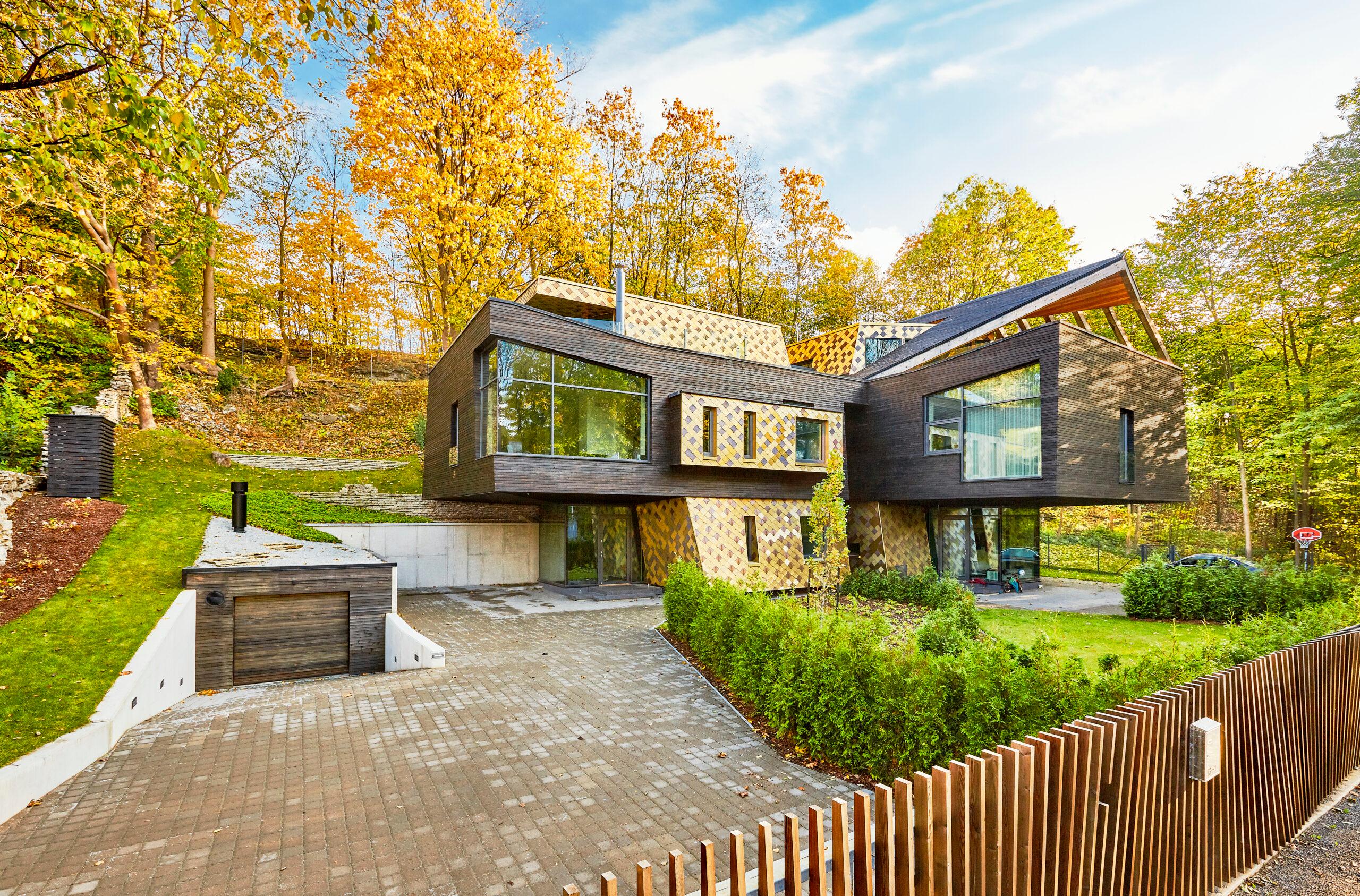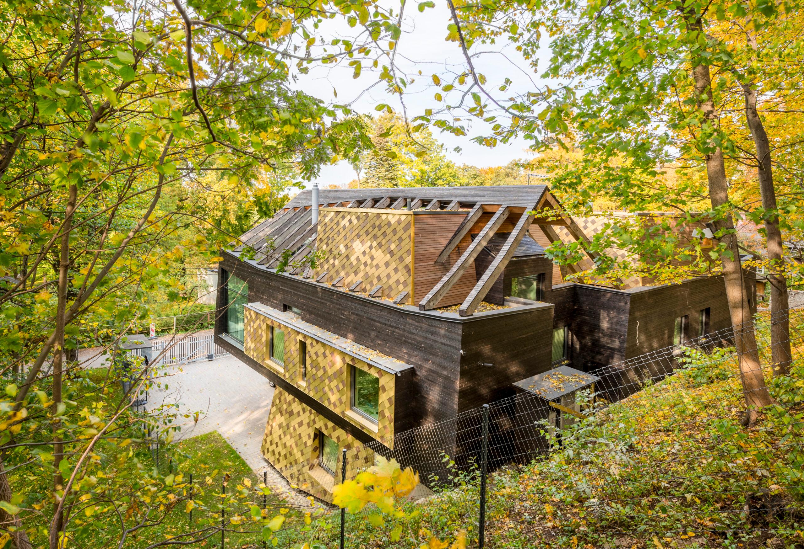 Põhimaterjalina on kasutatud puitu, millele sekundeerib rajoonile mitteomane vasklehtedest pind, mis meenutab kalasoomuseid.