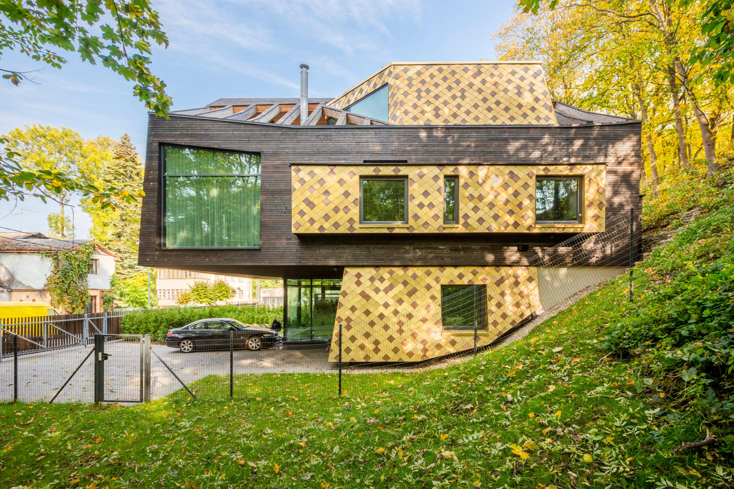 Põhimaterjalina on kasutatud puitu, millele sekundeerib rajoonile mitteomane vasklehtedest pind, mis meenutab kalasoomuseid.